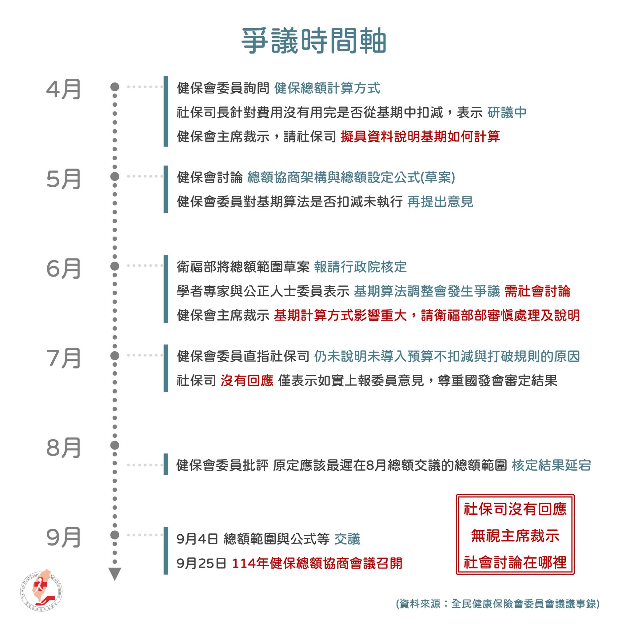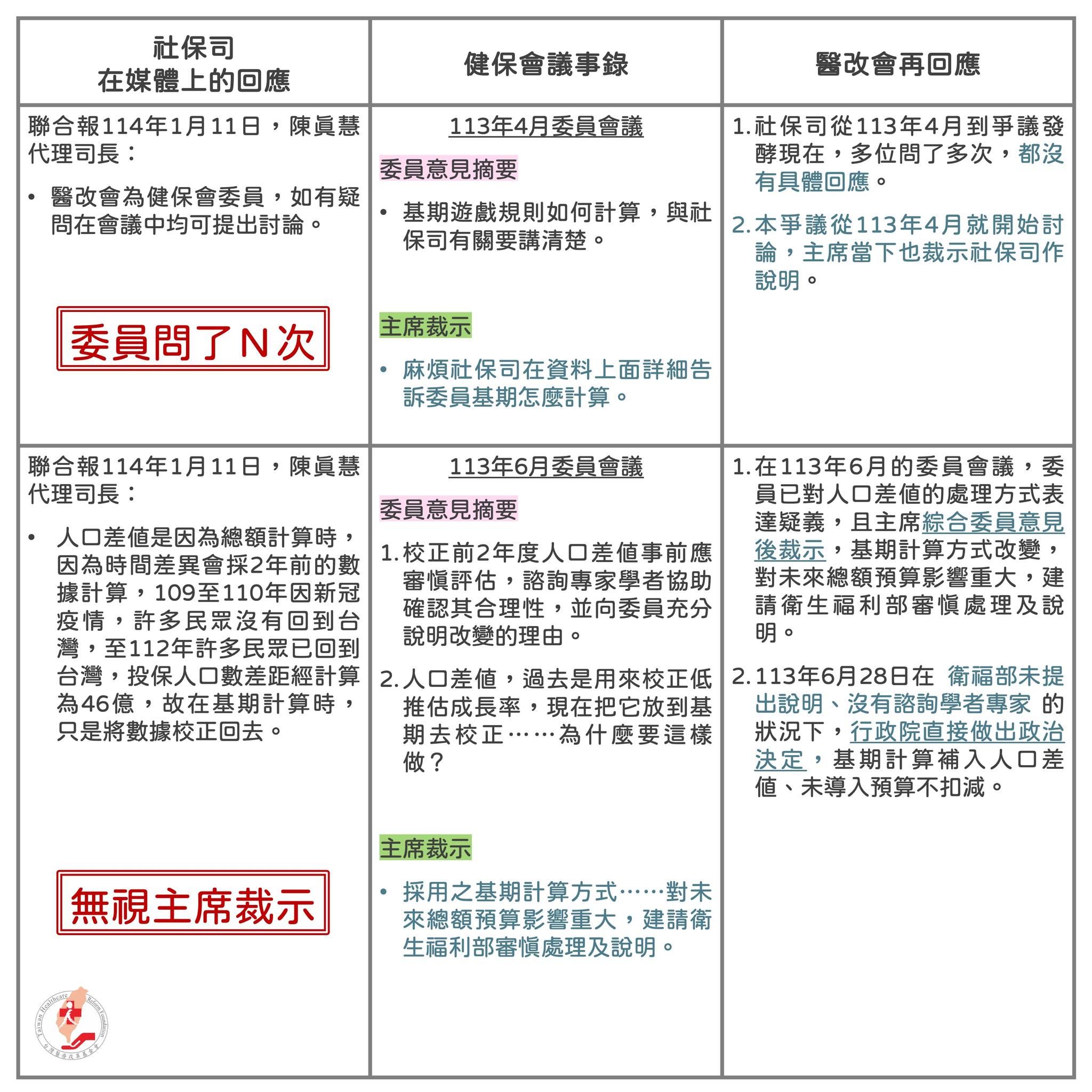 陳司長受訪提到,醫改會有疑問可以在會議中提出討論。但基期如何計算的爭議,早自113年4月就已發酵,健保會主席更裁示社保司,要檢附資料向委員說明計算方式。歷經多次委員會議討論,社保司未說明對基期改變爭議。健保會委員問了N次。