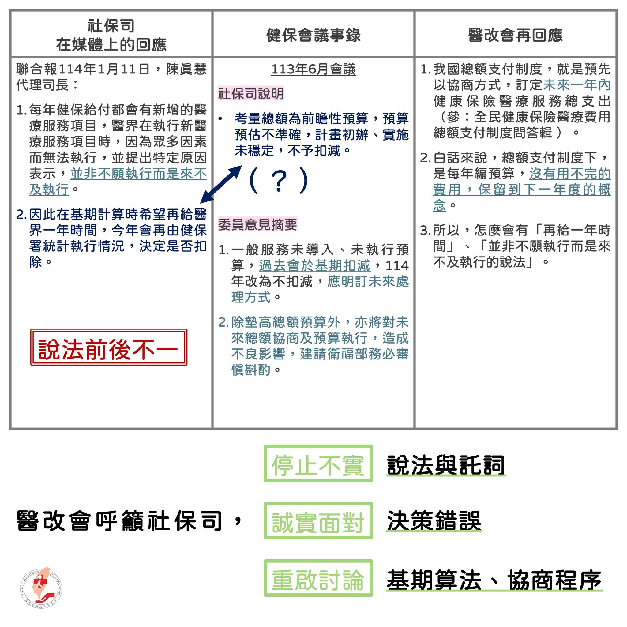 針對醫改會日前揭露114年度總額成長金額、總額基期計算爭議,社保司代理司長陳真慧卻於媒體受訪時喊冤,不知道社保司是不是喝了孟婆湯,讓我們還原113年健保會實況: