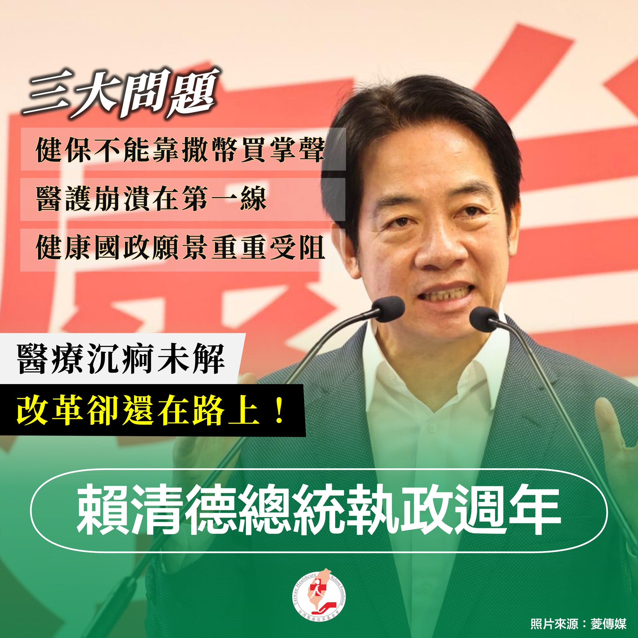賴清德總統上任滿一年,「健康台灣」喊得震天響,然而健保財務惡化、醫護過勞、資源失衡等老問題,依然未解。回顧這一年來的醫療與健保政策,更多是停留在美好藍圖的描繪,而非對根本問題的正視與解決。