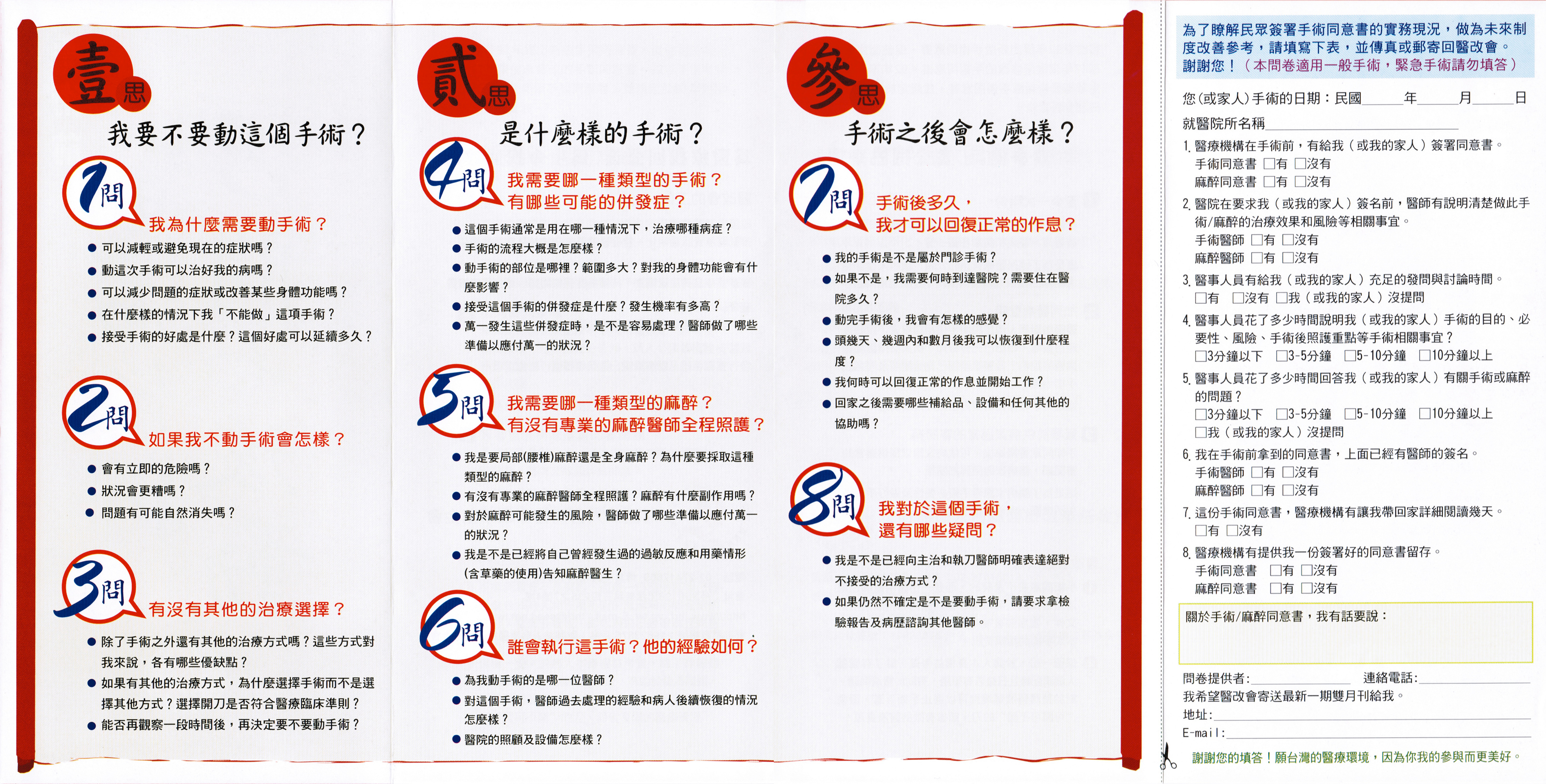 二、保留一份同意書,於病人本身權益考量,除了存留個人健康記錄之外,日後若有爭議,則有助於釐清問題。對於整體醫療環境,則可遏止手術浮濫,避免「可開可不開」的刀,節省有限的醫療資源。
