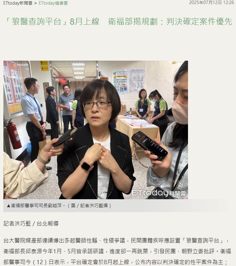 衛福部醫事司司長劉越萍於7/12(六)表示,「狼醫查詢平台」將於8月上線,但公布範圍僅限於「性平事件且已判決確定」者。然而,醫改會認為:這樣的資訊揭露標準遠遠不足以保護病人安全與就醫權益。